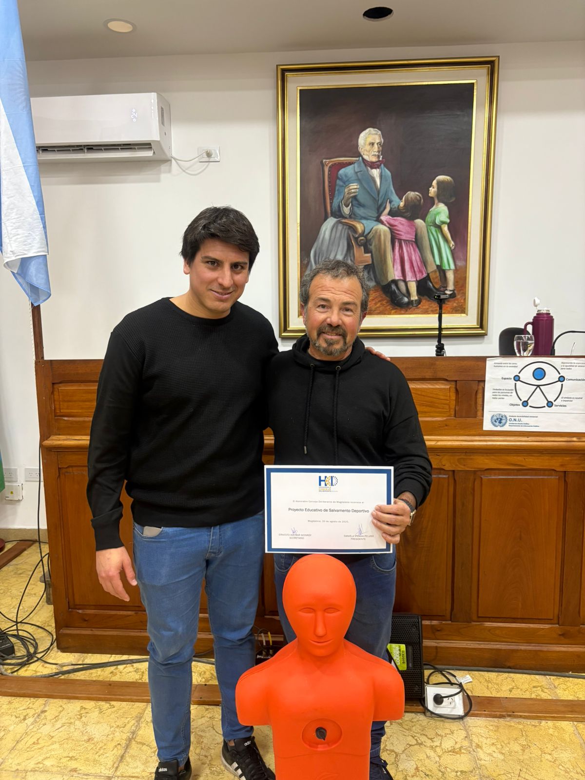 Matías Mingari y Gustavo Barrera en la entrega del diploma del reconocimiento en el Concejo Deliberante. FOTO: CEF 133