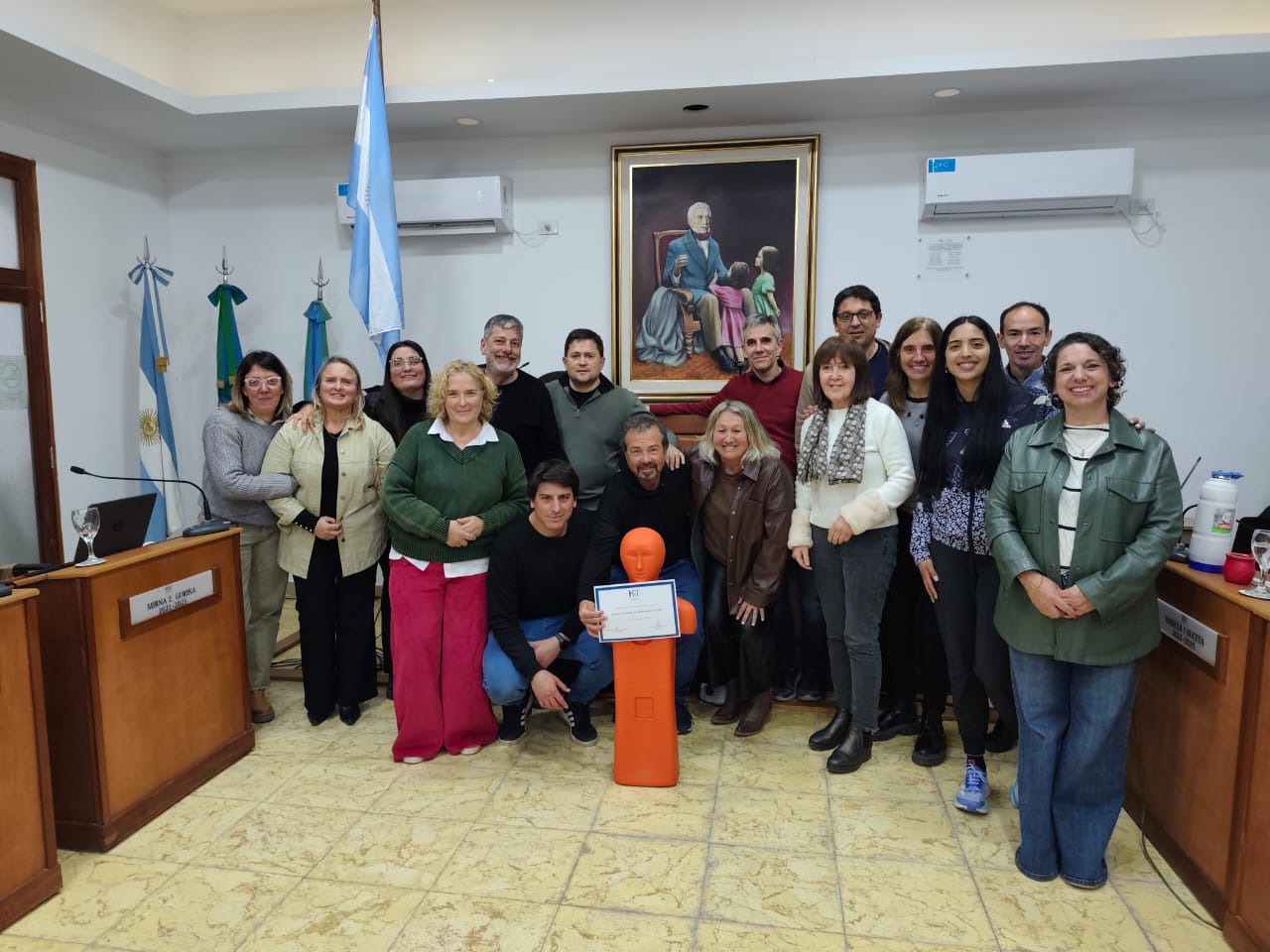 Foto de familia en la entrega de la distinción en la que aparecen los responsables del proyecto junto a los concejales y la presidenta del Concejo Deliberante de Magdalena, Daniela Viviana Peluso. FOTO: CEF 133