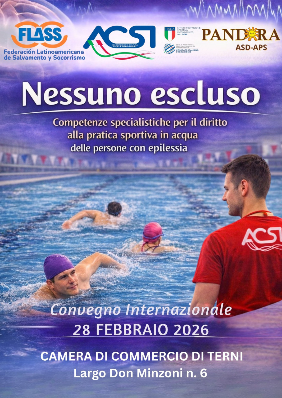 La FLASS, ACSI, y Pandora APS reúnen en Terni, bajo la coordinación de esta última y el lema ‘Nadie excluido’, a una veintena de personas expertas en neurología y especialistas en epilepsia y en neurofisiopatología, profesionales del salvamento acuático, técnicos deportivos y representantes de asociaciones de personas con epilepsia. El programa completo puede consultarse en este enlace.