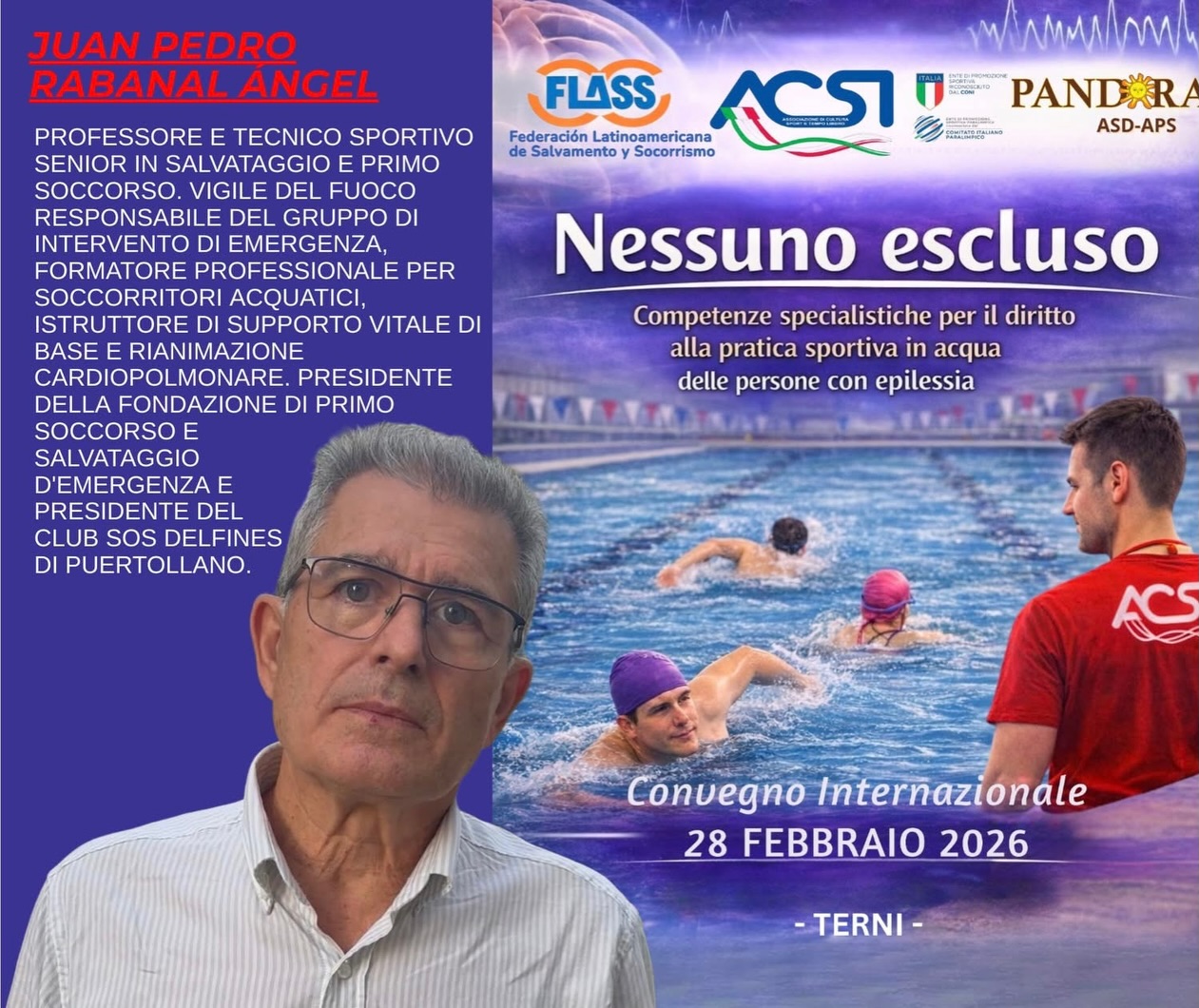 Tres miembros de la Asociación Latinoamericana de Salvamento y Socorrismo FLASS participarán en Terni (Italia) en el Congreso Internacional sobre el derecho a la práctica deportiva en el agua de las personas con epilepsia, que trata de dotar de competencias especializadas a los socorristas para actuar en el salvamento de personas con este trastorno neurológico.
